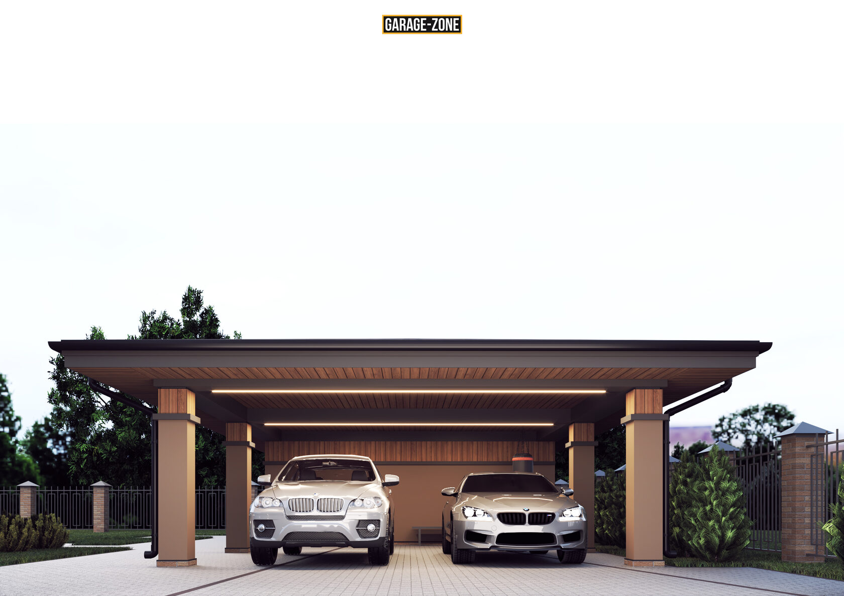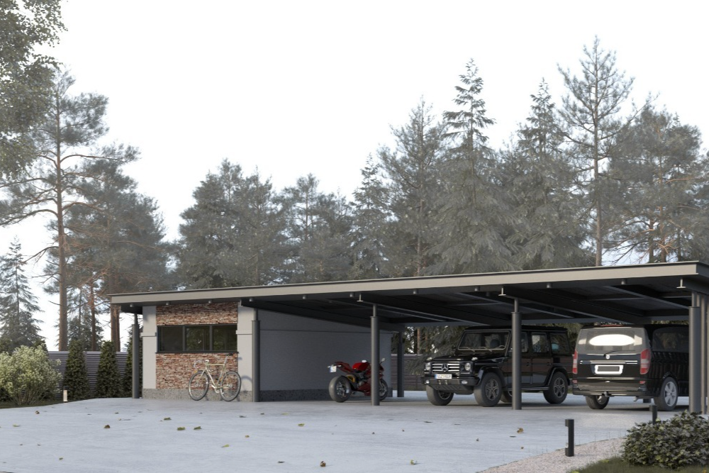 Большой навес на 2 автомобиля с баскетбольной площадкой и комнатой отдыха.
