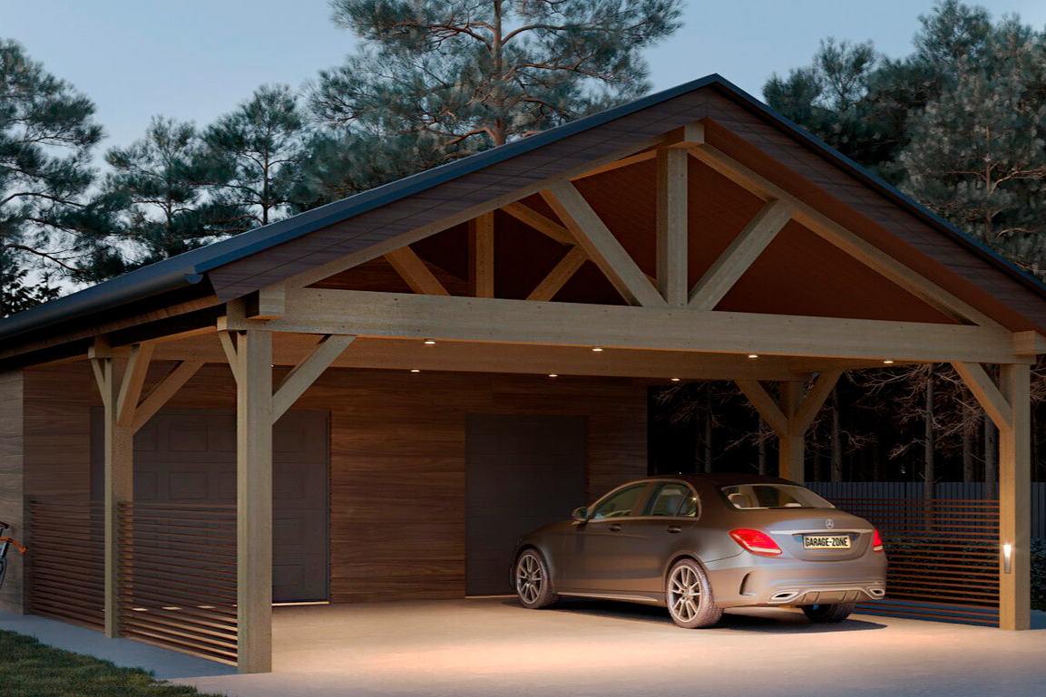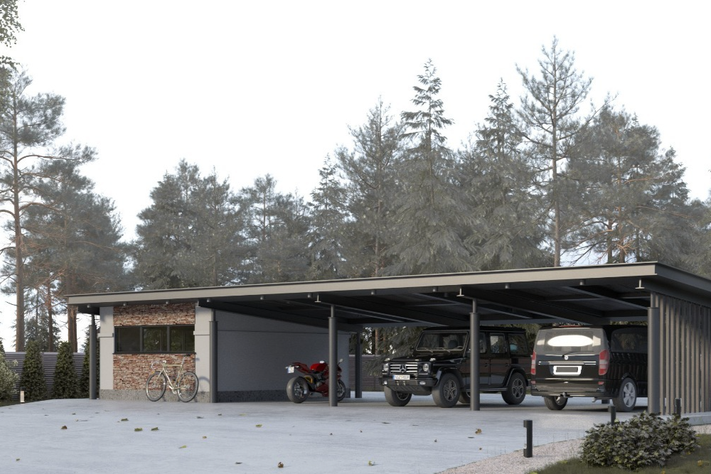 Гараж-навес на два машиноместа с жилым блоком для персонала. Проект представлен с двумя разными вариантами кровли.