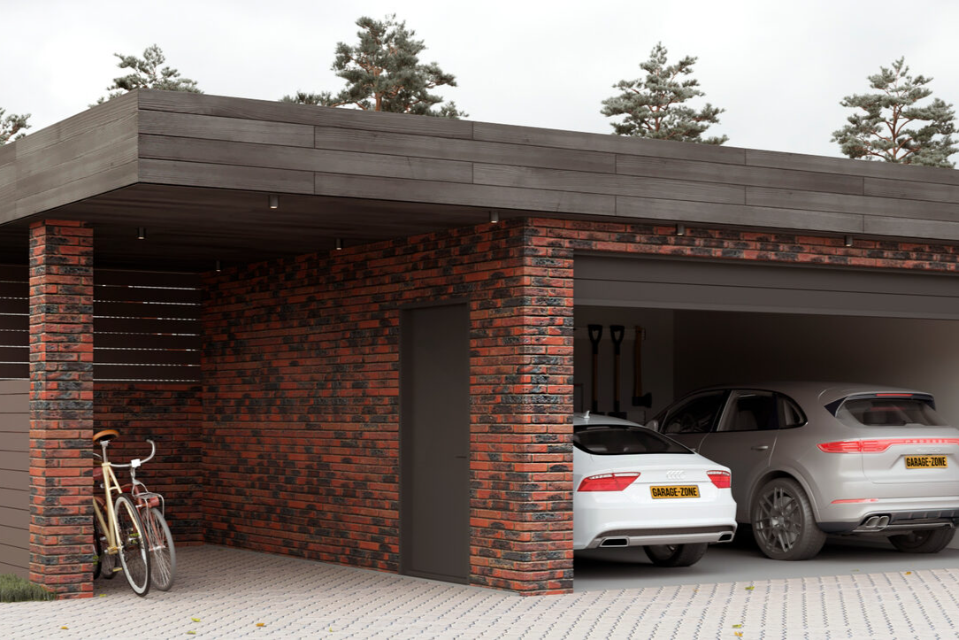 Интересный гараж на три машиноместа. Здесь применено сразу два необычных решения: стильные прозрачные автоматические ворота из стекла и зеленая терраса с шезлонгами на крыше.