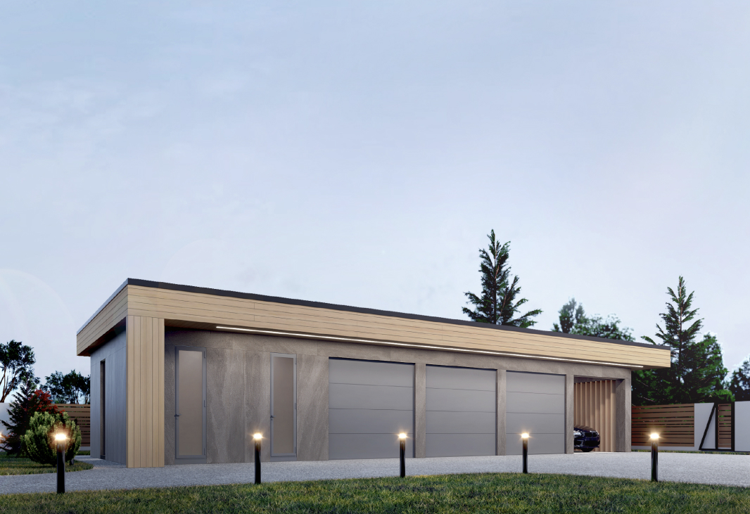 Гараж на три машиноместа с котельной. Два парковочных места предусмотрены под навесом и ещё одно во внутренней секции с автоматическими воротами. Силовая конструкция гаража выполнена из клееного бруса. Фасады гаража и котельной отделали имитацией бруса. На кровле применили цементно-песчаную черепицу.