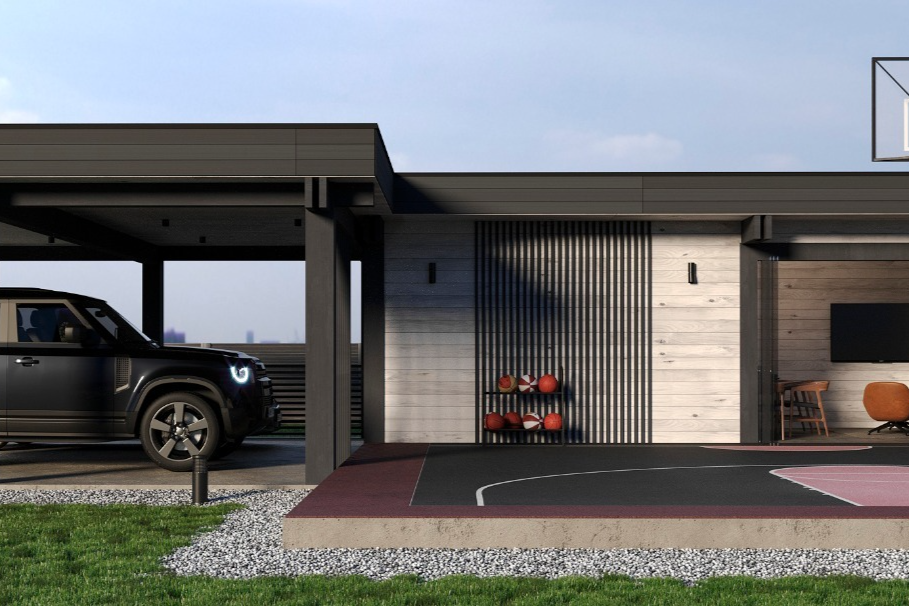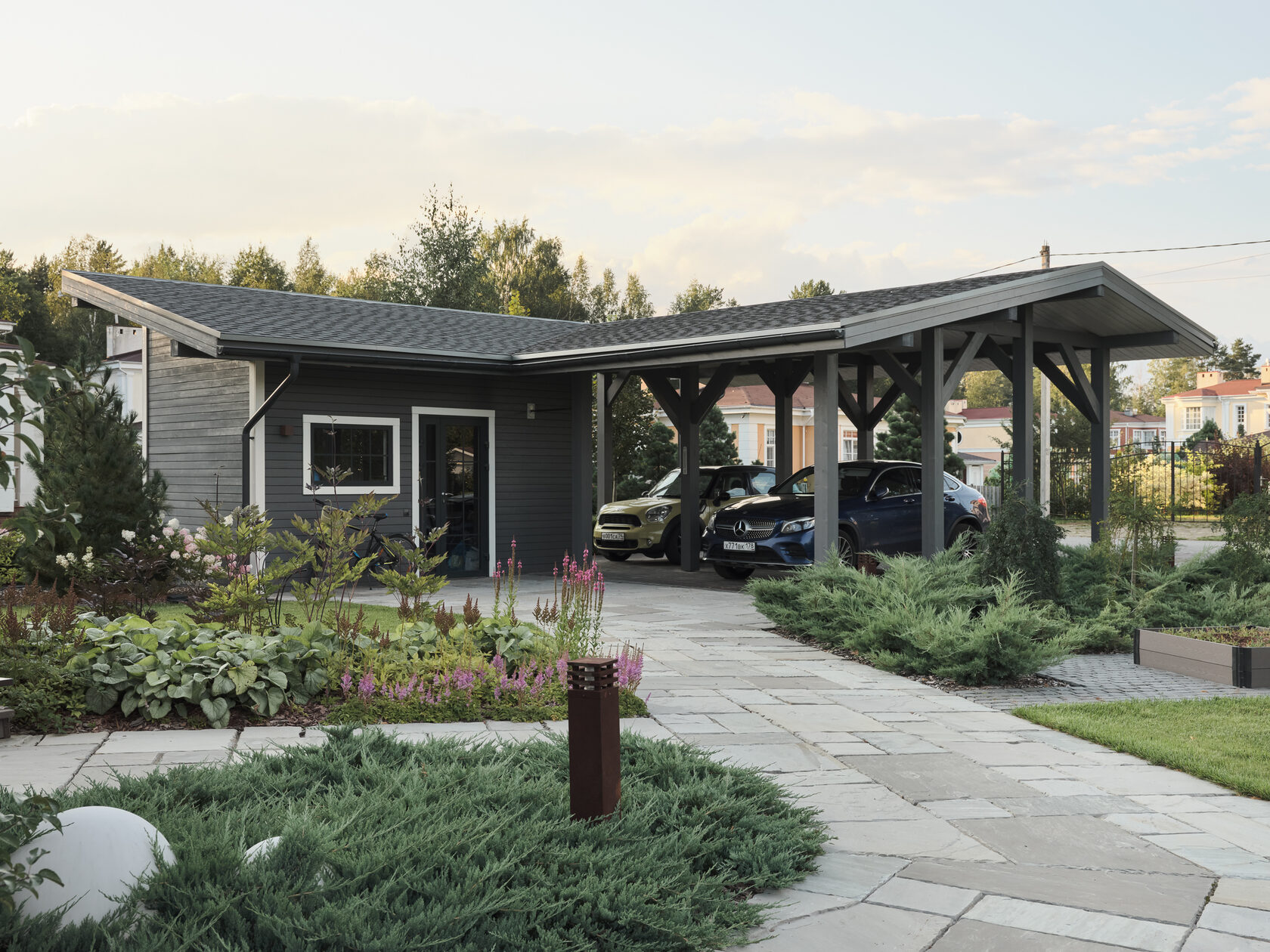 Гараж с навесом на 2 автомобился со спортивной зоной и секцией с хозблоком. Дизайн получился гармоничным, в общем стиле с архитектурой на участке. Гараж идеально вписан в ландшафт, с учетом высотных отметок.